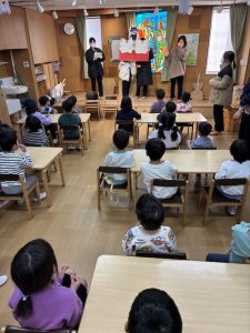 幼児クラス(あか・もも・しろ組)を対象に、園医である「ひがみ歯科立川クリニック」の皆さんによる歯磨き指導が行われました。講話を聞いた後、歯磨きとフロスの方法について指導を受けました。