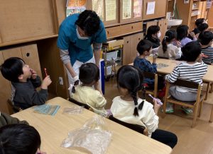 もも・しろ組ではご家庭でもフロスをしたことがある子が多く、自分で上手にフロスを持って上下の歯の隙間をお掃除することができていました。最後の質問コーナーへも積極的に参加する姿がありました。