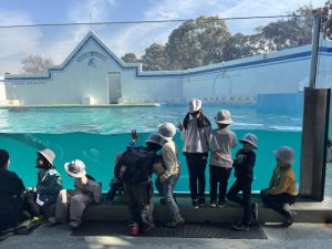 水族館ではグループに分かれて館内を回りました。水槽を見る子ども達の目はキラキラ輝き「大きいね」「面白い口だよ」「綺麗な色だね」とそれぞれ観察を楽しんでいました。お腹が空いたというリクエストに応えて、少し早めのお弁当。午後はイルカショーを楽しみました。イルカが飛ぶと「わぁー!」と歓声をあげ大興奮の白組さん。