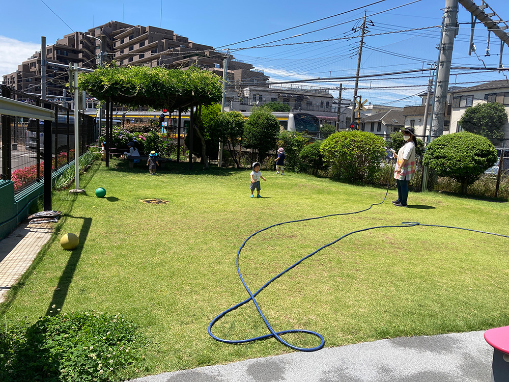 伝統の家庭的雰囲気を大事にしながら、園舎の北側に砂場・遊具、南側に緑地や畑と、広い敷地が特徴です。