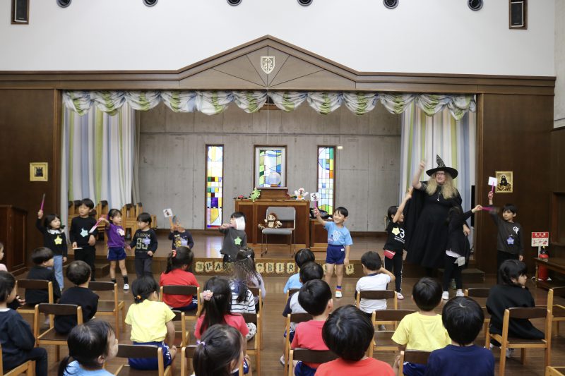 まずは仮装したクリスティー先生と、みんなで楽しく英語遊び。