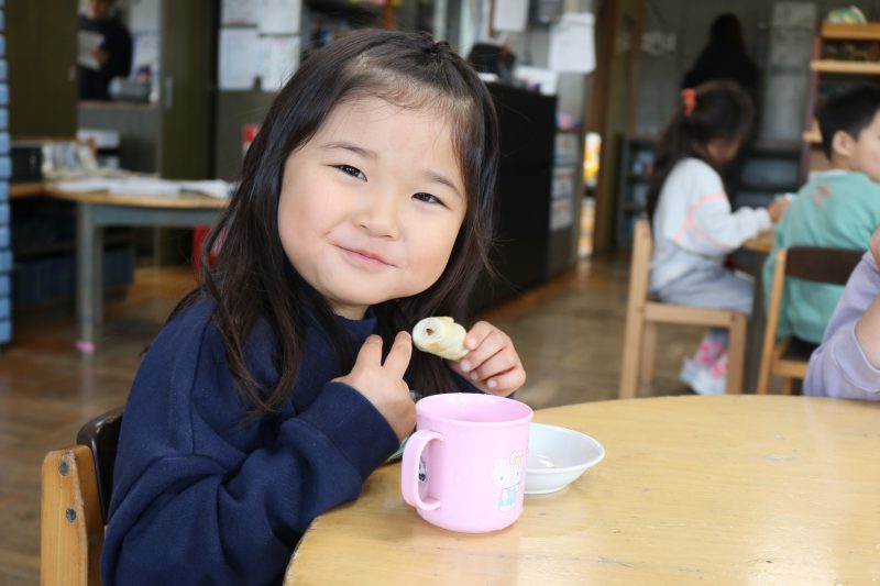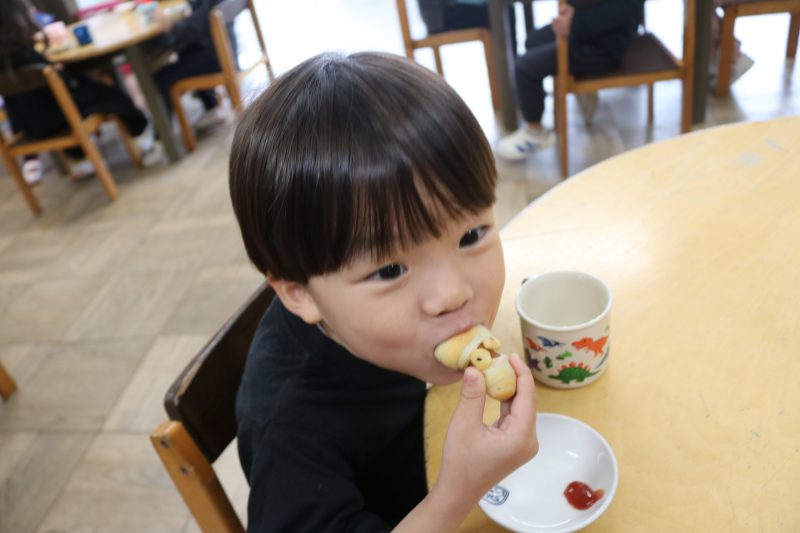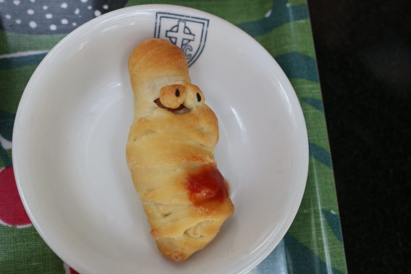 この日のおやつには、調理の先生がハロウィンならではの「ミイラパン」を作ってくれました。