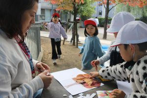 園庭の木々が少しずつ色づき、落ち葉のじゅうたんが広がってきました。