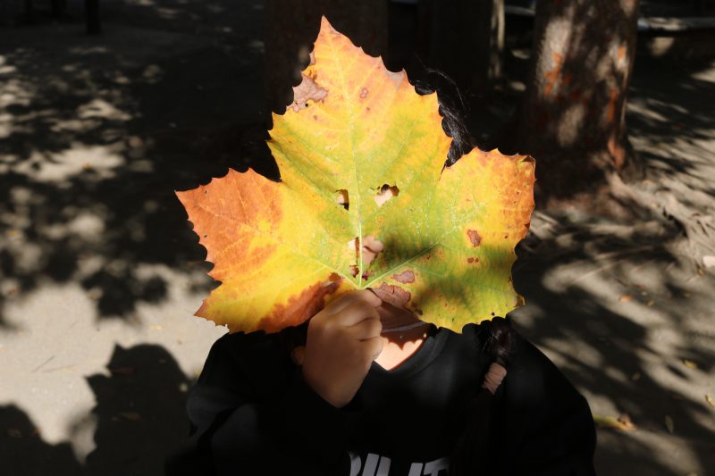 子どもたちは葉っぱを拾い集めたり、虫を見つけたりしながら、
